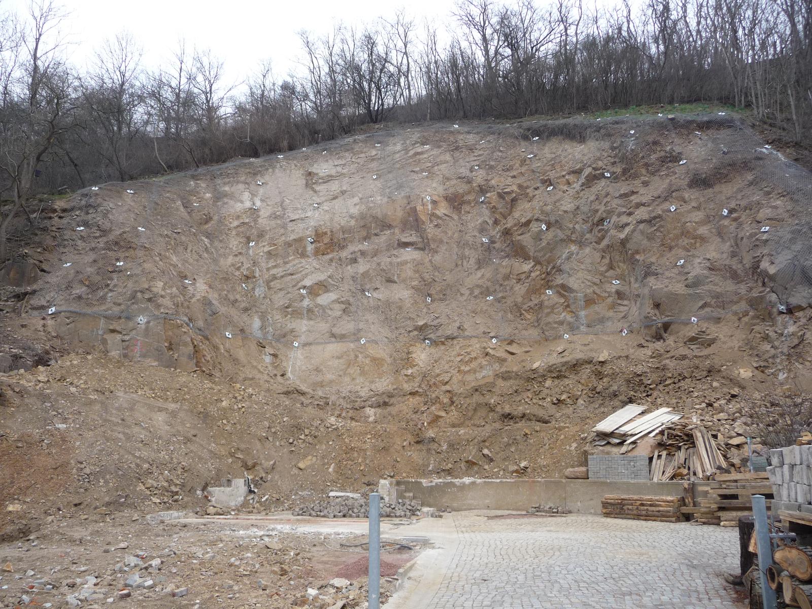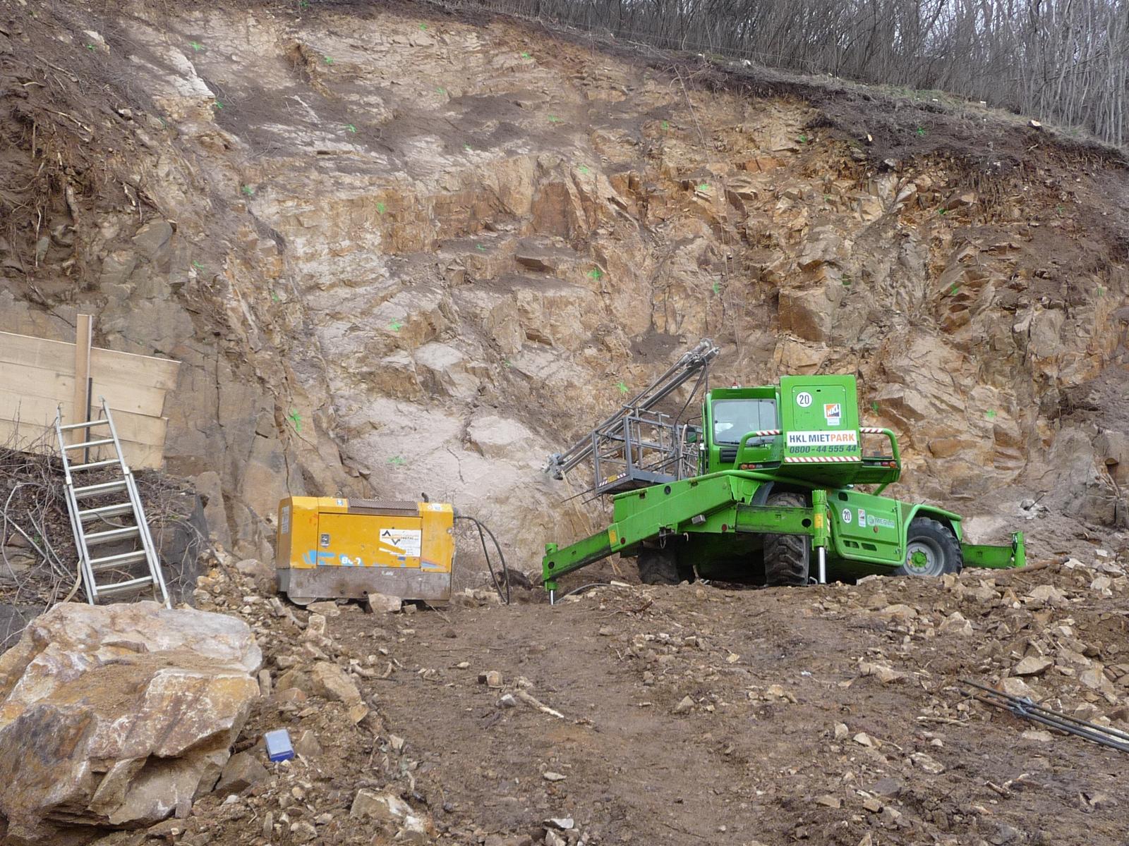 Bereissen der Felswand, Einbau von Nägeln und Schutznetzen